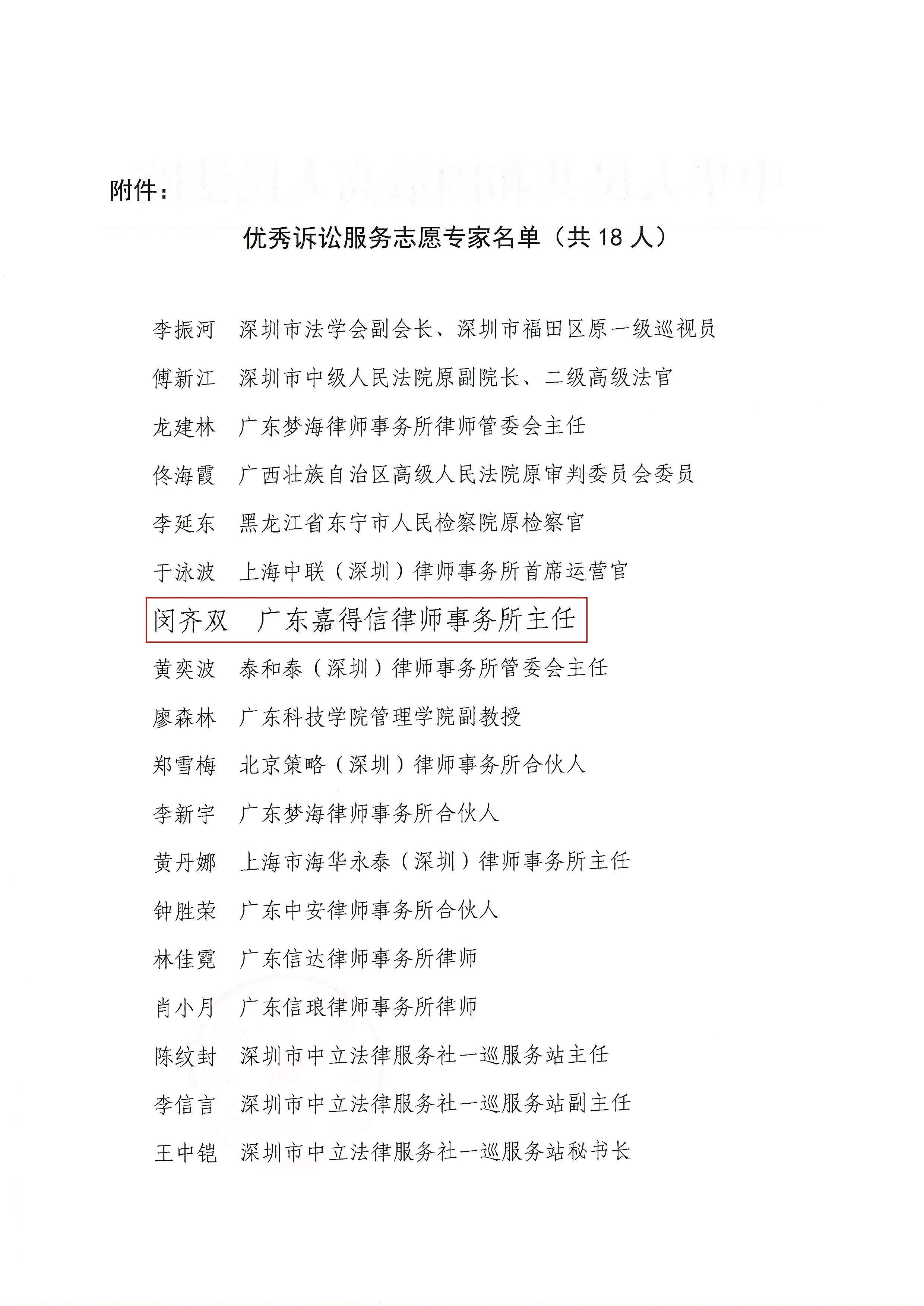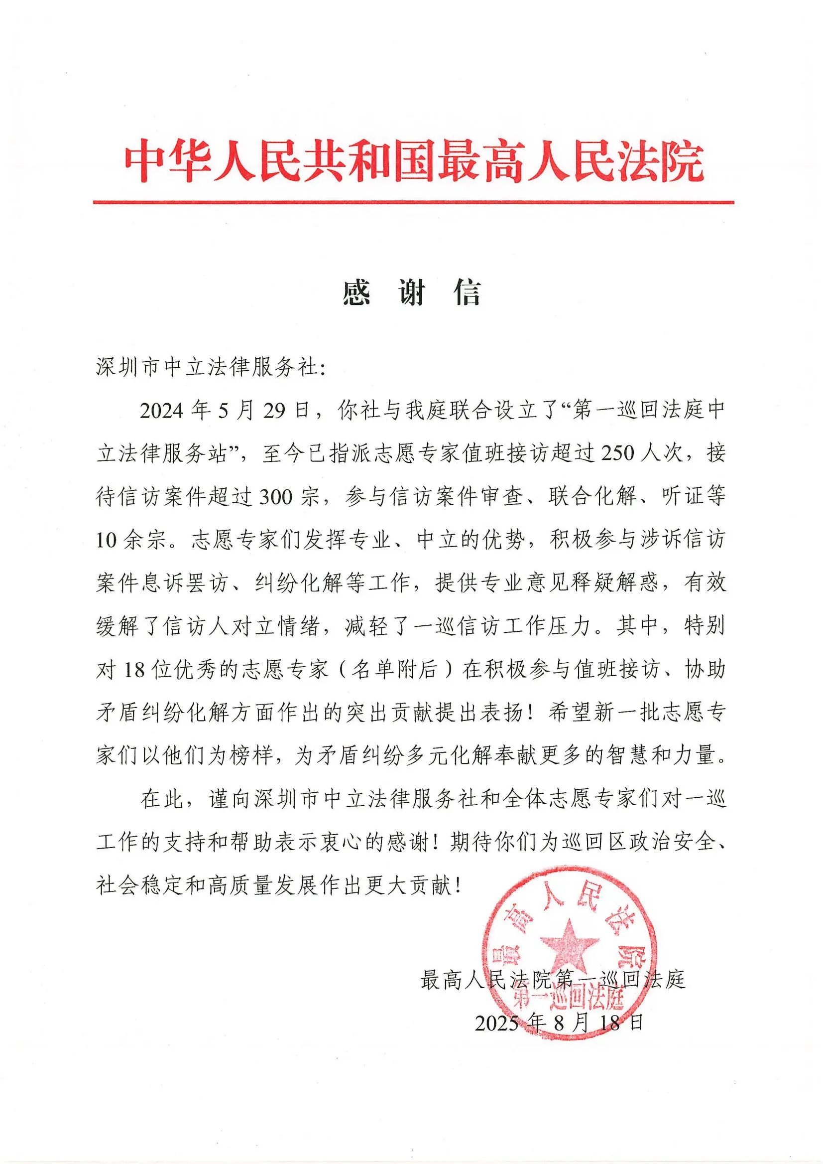 8月18日,最高人民法院第一巡回法庭向深圳市中立法律服务社发来感谢信,对深圳市中立法律服务社及全体志愿专家在涉诉信访案件化解等工作中的支持与贡献表示衷心感谢,其中,特别对闵齐双主任等18位优秀的志愿专家在积极参与值班接访、协助矛盾纠纷化解方面作出的突出贡献提出表扬!
