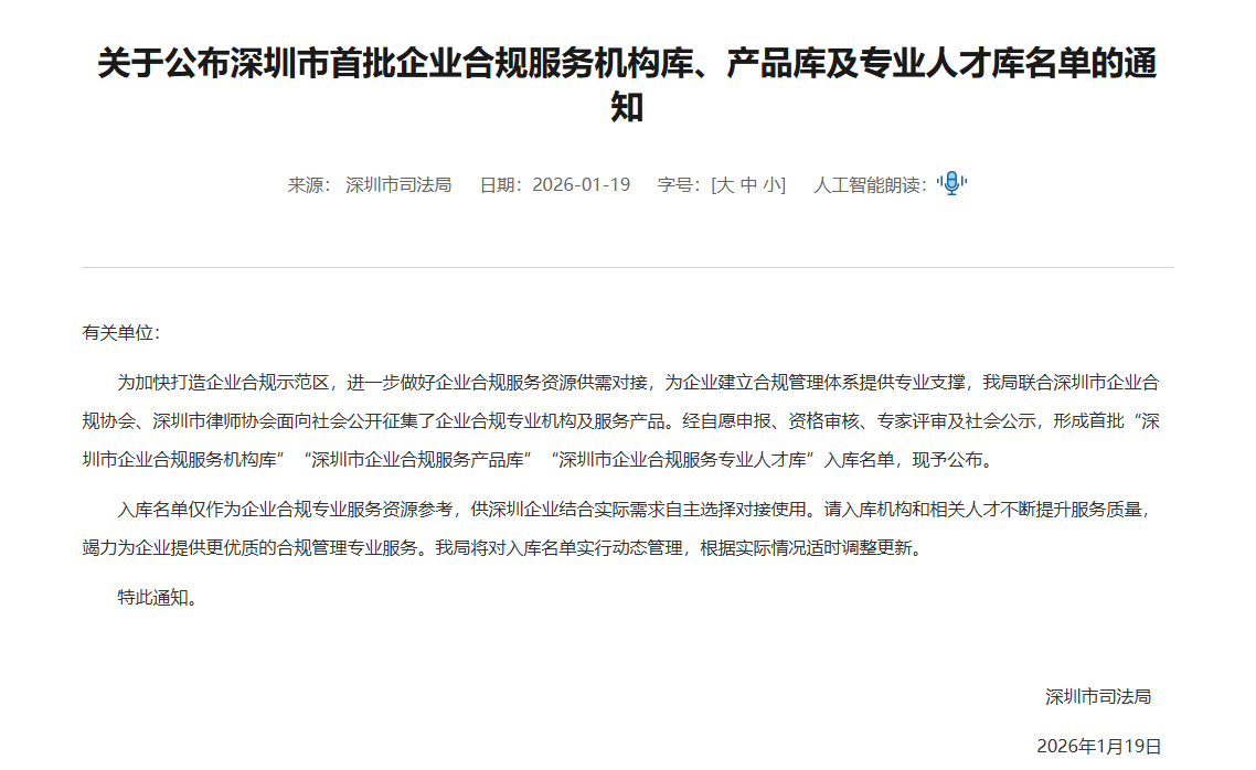 经自愿申报、资格审核、专家评审及社会公示,广东嘉得信律师事务所凭借在企业合规领域深厚的专业积淀、丰富的实务经验,成功入选“深圳市企业合规服务机构库、产品库及专业人才库”名单。