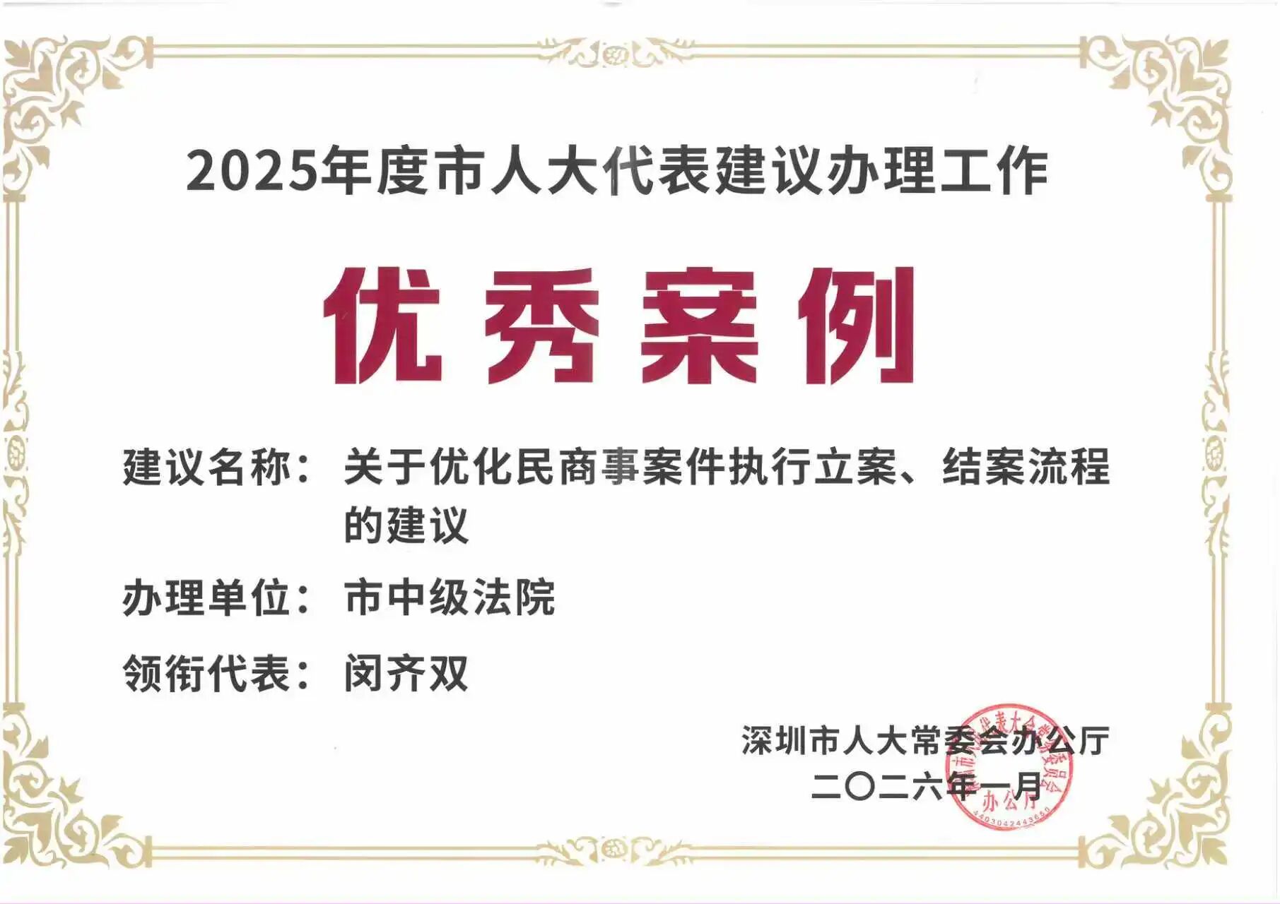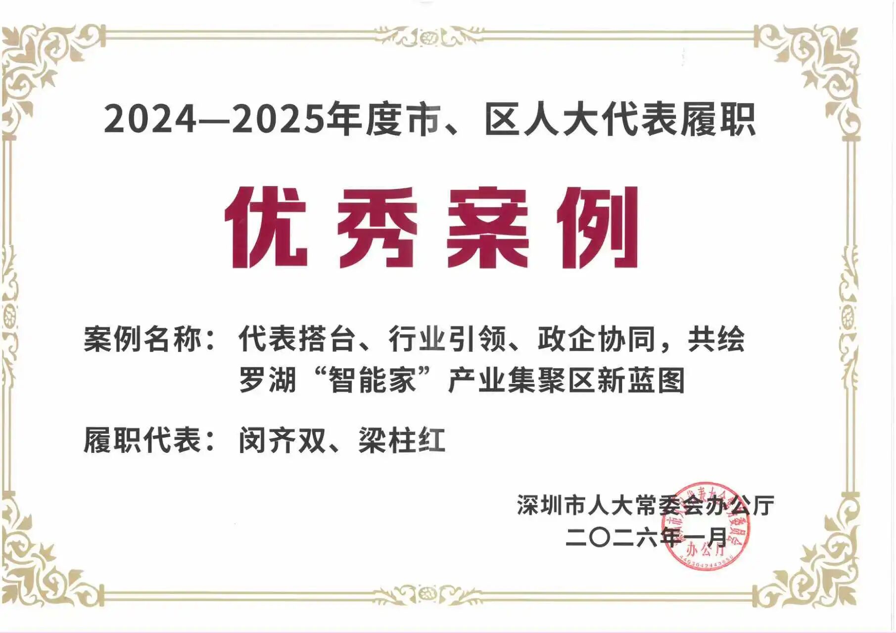 闵齐双代表领衔提出的《关于优化民商事案件执行立案、结案流程的建议》,获评2025年度市人大代表建议办理工作优秀案例。闵齐双代表与梁柱红代表共同提报的《代表搭台、行业引领、政企协同,共绘罗湖 “智能家” 产业集聚区新蓝图》,入选2024-2025年度市、区人大代表履职优秀案例。