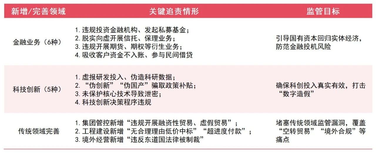 针对金融业务,首次单设金融业务专款,明确将违规参与私募基金、开展脱实向虚的信托与金融衍生品业务等行为明确列为追责情形,强化了服务主业、防控风险的监管导向;在科技创新领域,针对性打击虚假创新行为,将制售伪创新产品、虚报研发投入、通过空壳公司骗补骗扶等纳入追责清单,规范科研资源使用;在境外经营方面,则新增违反境外国有产权管理制度、违规支付中介费用等情形,进一步强化全过程的风险管控。同时,在集团管控、股权投资等传统领域,新《办法》细化了多层架构规避监管、以大额负债形成非主业资产等追责标准,通过分类列举压缩自由裁量空间。